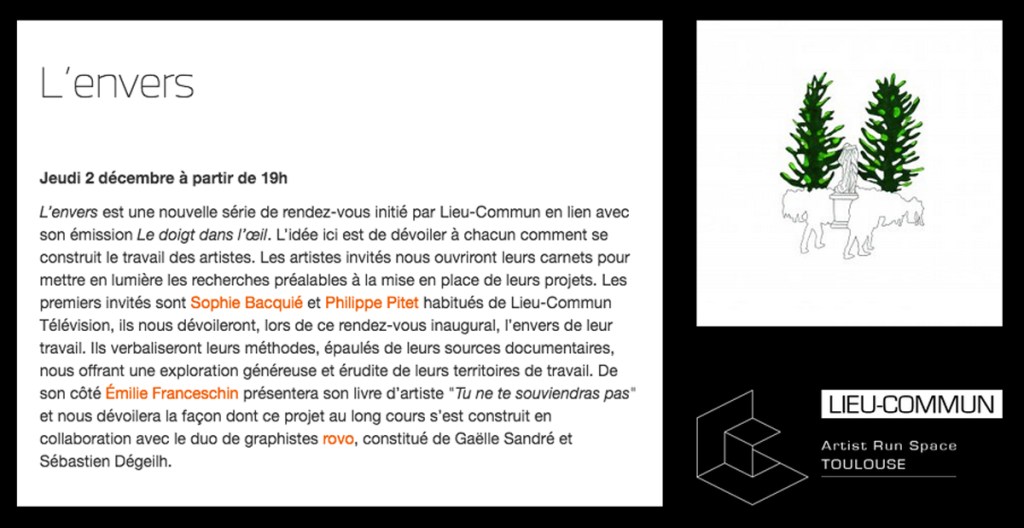 « L’envers » est une nouvelle série de rendez-vous initié par Lieu-Commun [+] en lien avec son émission Le doigt dans l’œil [+]. L’idée ici est de dévoiler à chacun comment se construit le travail des artistes. Cette première expérience aura lieu dans le cadre du Festival Graphéine [+].